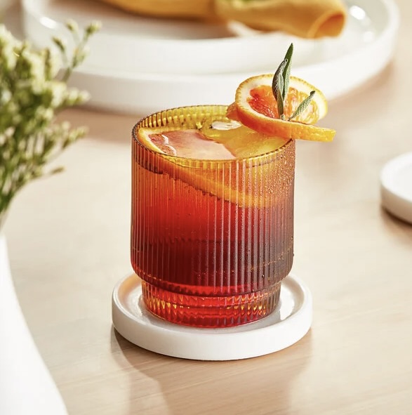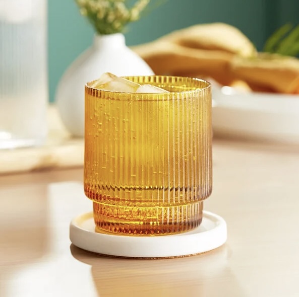 This glass is ideal for serving whiskey and other fine spirits neat, on the rocks, or in cocktails. Its sleek and modern design features subtle ribbed lines that are sure to catch the eye of your guests. The textured surface of the glass provides a tactile feel in your hand. The glass’s amber color will add a touch of warmth to your tabletops!