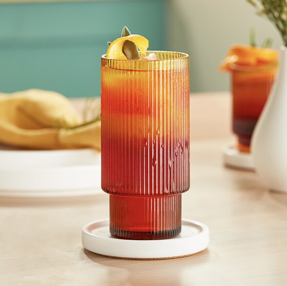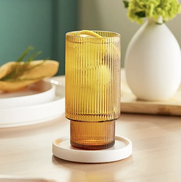 This glass is ideal for serving iced tea, sparkling water, and signature cocktails. Its sleek and modern design features subtle ribbed lines that are sure to catch the eye of your guests. The textured surface of the glass provides a tactile feel in your hand. The glass’s amber color will add a touch of warmth to your tabletops!