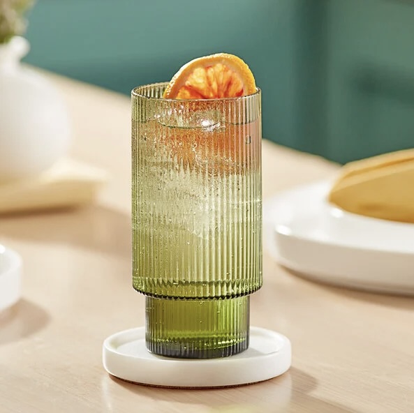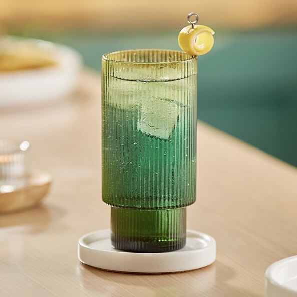 This glass is ideal for serving iced tea, sparkling water, and signature cocktails. Its sleek and modern design features subtle ribbed lines that are sure to catch the eye of your guests. The textured surface of the glass provides a tactile feel in your hand. This glass’s rich green color will add an enticing look to your tabletop displays!