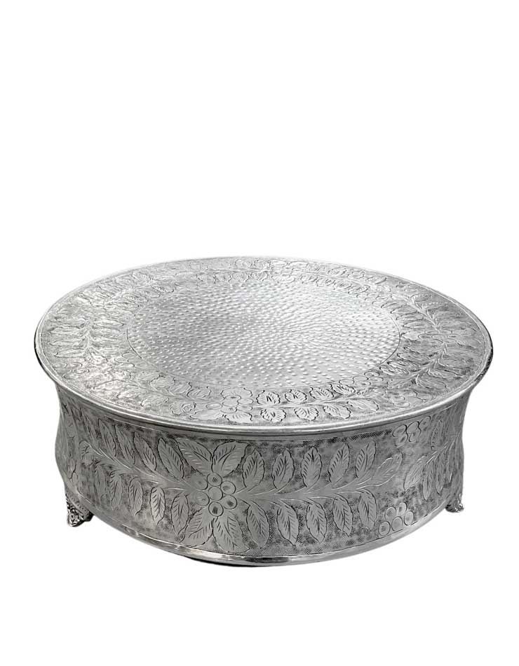 The Round Aluminum Cake Stand is a stunning and ornate display piece, perfect for weddings, dessert tables, and upscale catering events. With its intricately embossed floral pattern and hammered texture, this stand adds an elegant, vintage-inspired touch to any cake or dessert presentation.