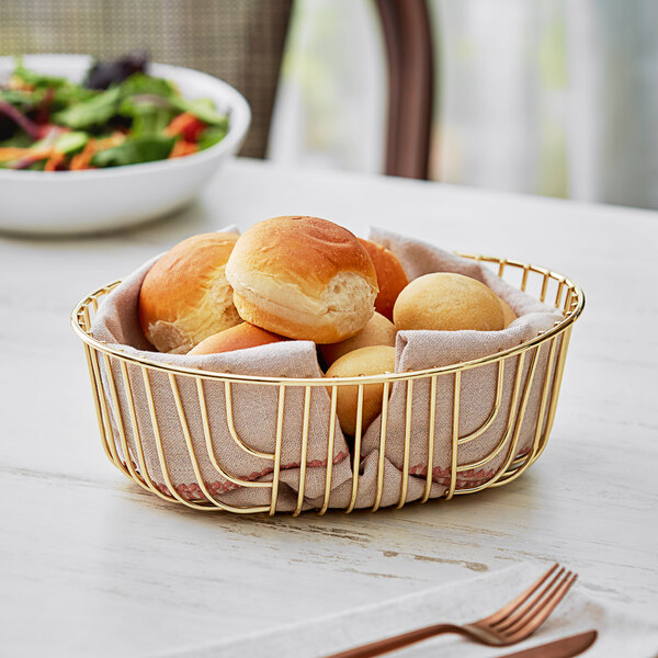 Its open-wire design is perfect for displaying artisan bread, rolls, or fruit, making it a versatile piece for formal dinners, brunch events, and upscale food presentations. Lightweight and easy to handle, this basket ensures seamless table service while enhancing your event’s aesthetic.