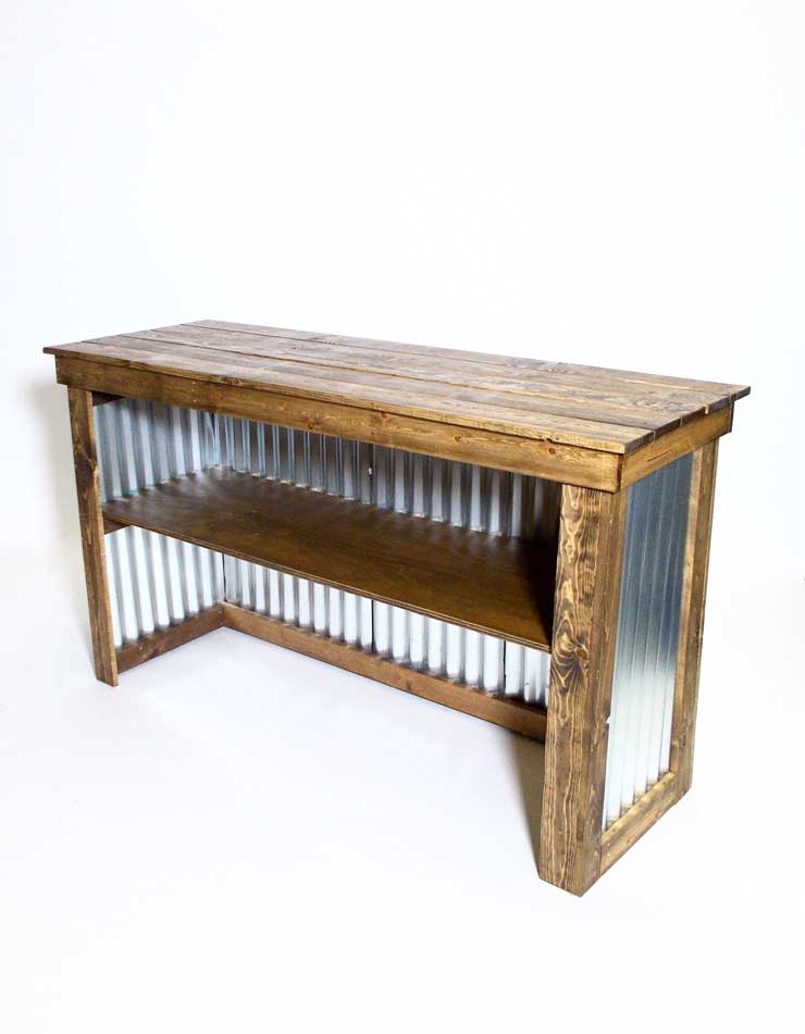 Blend style and functionality with our Corrugated Metal Event Bar. Showcasing an appealing corrugated metal siding design, this bar provides a sturdy service area framed in natural wood. Measuring 72″ W X 24″ D, it serves as a perfect centerpiece for events ranging from rustic chic to distressed industrial themes. Its fusion of metal and wood effortlessly complements a variety of styles and decor. Get ready to make a style statement with our rustic corrugated metal bar rental in Las Vegas. RSVP today!