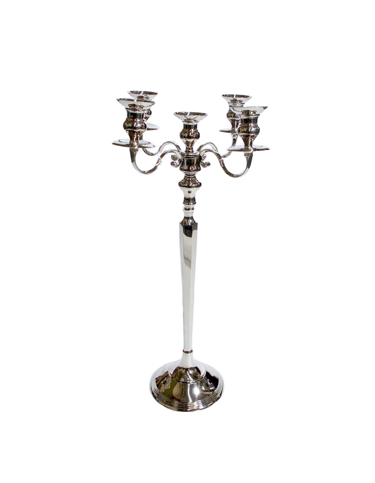Elevate your event’s ambiance with our Classic Silver 5 Arm Candelabra. Nickel-plated for added refinement, its grand stature and intricate design infuse a touch of timeless elegance, making it an exquisite centerpiece for any occasion.