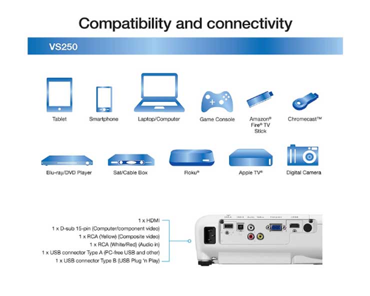 Introducing the Epson VS250 Power Point Projector, designed for clarity and precision in any setting. Experience more accurate and vivid colors, even in well-lit rooms, making it ideal for everyday presentations and graphics. With easy setup, this projector is compatible with both PC and Mac. For detailed operating instructions, click here.
