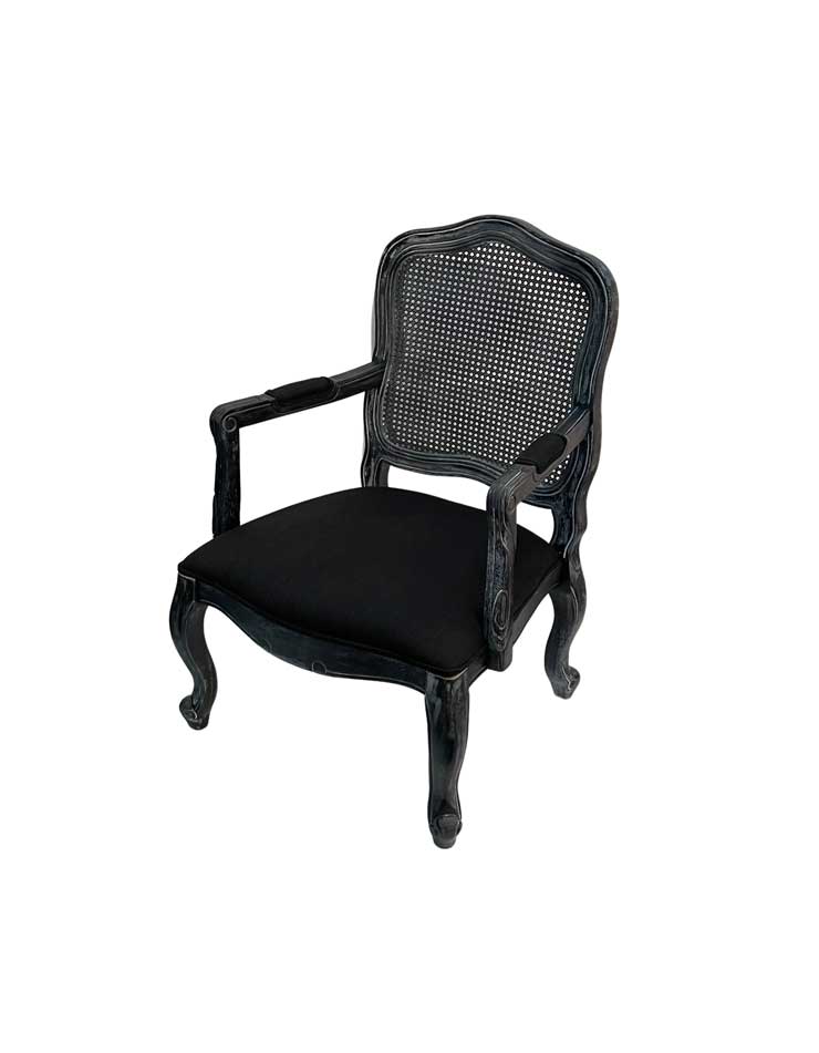 The Calais Armchair – Black/Black is a striking blend of vintage charm and modern sophistication, making it an elegant choice for upscale events. Its ornate wooden frame with a distressed black finish exudes timeless appeal, while the woven cane backrest adds texture and breathability. The plush black cushion ensures comfort, making it ideal for both lounge settings and formal seating arrangements.