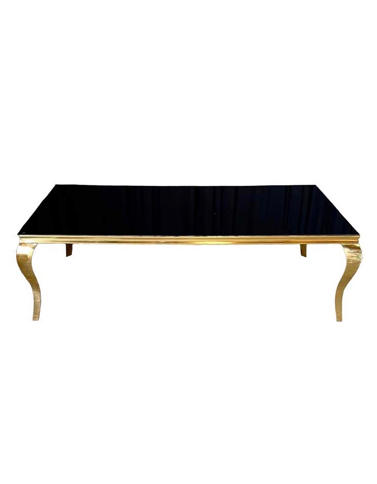 Event planners love how this dining table rental instantly transforms any space into a sophisticated dining destination. The dramatic contrast between the black glass and gold baroque legs photographs exceptionally well under both natural light and romantic candlelit settings.